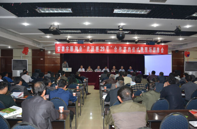 2014年10月19日上午,安徽宇順種業(yè)開發(fā)有限公司“武運(yùn)粳29號”合作簽約儀式暨現(xiàn)場觀摩會(huì)在合肥肥西三河國際大酒店隆重召開。
